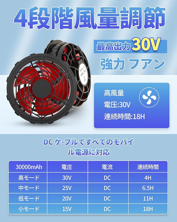 【4段階風量調節・様々なシーンに対応】(30V 30000mAh.(別売)と組み合わせてご使用の場合、作業服ファンの風量は4段階に切替できます。電圧30V :約168リットル/秒、電圧25V :約130リットル/秒、電圧20V :約115リットル/秒、電圧15V : 約100リットル/秒、※風量はメーカー基準で測定した値です。ご使用時の目安としてください。