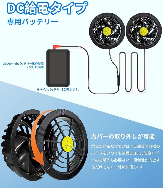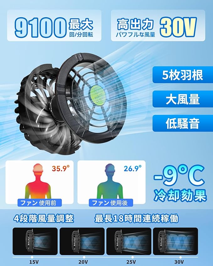 CYCYHEAT 空調作業服 ファン 30V超高出力 薄型 DCケーブル付 5枚羽根 超大風量 ブラシレスモーター 冷却服ファン 取り外し可能 空調作業ベスト/半袖/長袖対応 熱中症対策 暑さ対策グッズ 穴直径9cmのあらゆる作業服適用 | oioioichan