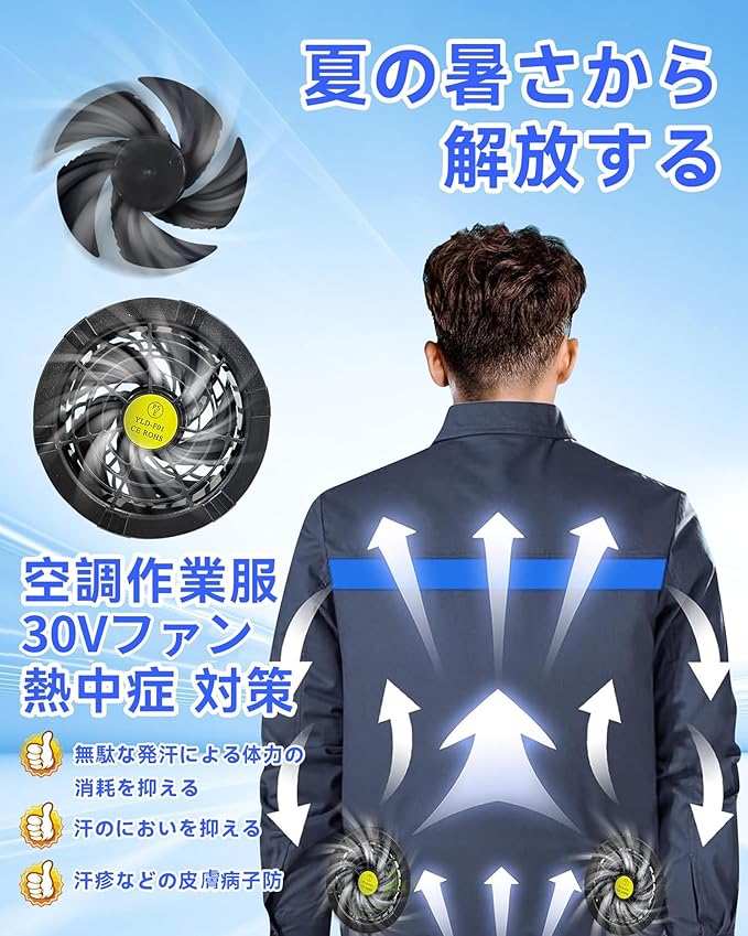 【強風・低騒音】ブラシレスモーターを装備しているこの高品質のファンは、同類製品に比べると、驚きほどのパワーで強力送風して涼しさを保つことができるだけでなく、低騒音。30V 超強力 ファン付き 気流を胸方向や背中方向に集中させることも可能です。夏の幅広い現場作業において、疲労軽減、作業効率の向上、熱中症対策にも効果あります。