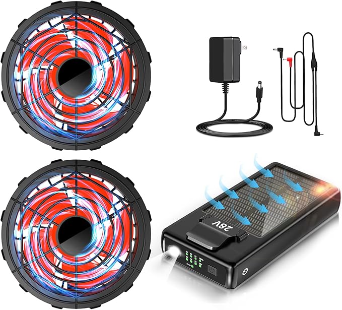 【高い交換性&幅広い利用シーン】ファン取り付け部の直径サイズは9cmで、市販の90%の空調作業服、空調ベスト、空調パンツに対応でき、互換性が非常に高いです!最新型ファンはABS樹脂を使用し重さ94g/個、厚さ3.8cmで超軽量・超薄型ながら衝撃に強い耐久性を兼ね備えています。建築・土木・工場内作業・漁業・林業・農場・農園・野外作業・運送業・倉庫内作業・登山・ウォーキング・ゴルフ・ツーリング・キャンプ等、夏のスポーツ・レジャーなど様々なシーンで大活躍!【セット内容】:28Vファン*2 専用.*1 接続ケーブル*1 急速充電器*1 Type-Cケーブル*1 取扱説明書*1。
