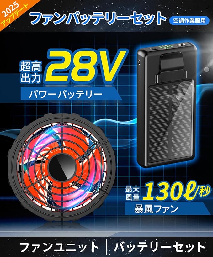 ファン . セット28V超高出力 30000mAh大容量 5段階風量調 暴風 ソーラーパネル搭載 . 空調ファン 日本製ブラシレスモーター 90mm服穴径対応 急速充電器付き ベスト用 空調作業服用 PSE認証済 猛暑対策 | oioioichan