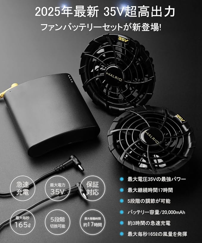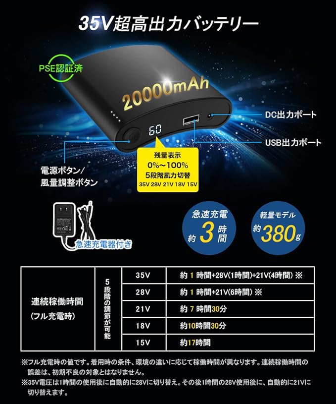【.進化】業界最強の35V超高電圧出力、20000mAh超大容量.は世界最小&最軽量クラスです。重さは約380gで身体への負担が少ないです。約3時間の急速充電でストレスフリー!日本のPSE認証を取得しているので、長期間安心して使用できます。風量切替(35V/28V/21V/18V/15V)はワンボタンでの簡易操作、ボルト数や電池残量を数字で表示できるLEDディスプレイも便利です。稼働時間:15V(約17時間)、18V(約10.5時間)、21V(約7.5時間)、28V(約7時間)、35V(約6時間)※気温や着用条件などにより稼働時間が異なる場合があります。必要に応じて風力を調整することができます。