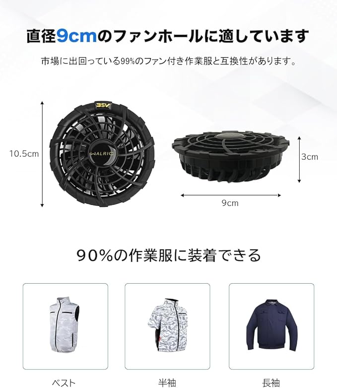 【高い汎用性ファン&様々なシーンで大活躍】ファン内径9cm、外径10.5cmの標準仕様で、直径9cmのファン専用穴のファン付き作業服対応できます。最新型ファンはABS樹脂を使用し、衝撃に強い耐久性を兼ね備えています。建築・土木・工場内作業・漁業・林業・農場・農園・野外作業・運送業・倉庫内作業・登山・ウォーキング・ゴルフ・ツーリング・キャンプ等、夏のスポーツ・レジャーなど様々なシーンで大活躍!