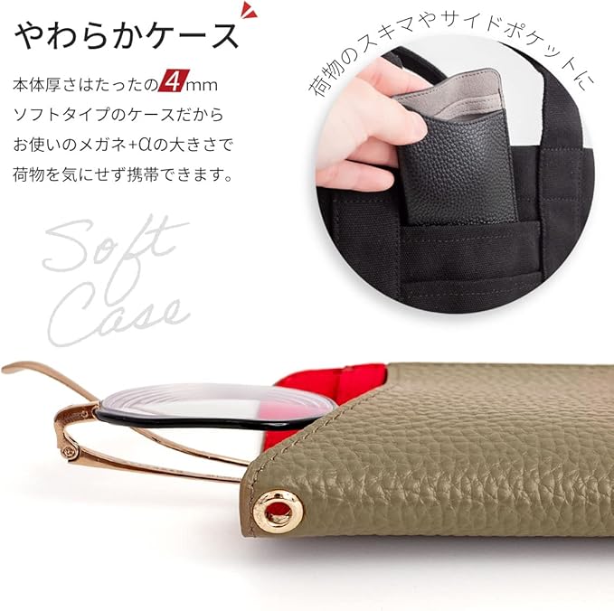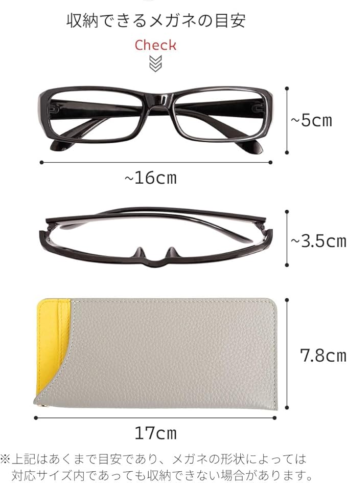 【商品サイズ】縦 78mm 横 170mm 厚み 15mm(最厚部)・重さ 31g 【収納可能サイズ】縦 50mm 横 160mm 厚み35mm程度までのメガネ ※メガネの形状によっては対応サイズ内であっても収納できない場合があります。 【素材】・表地:牛革 ・内側:レーヨン