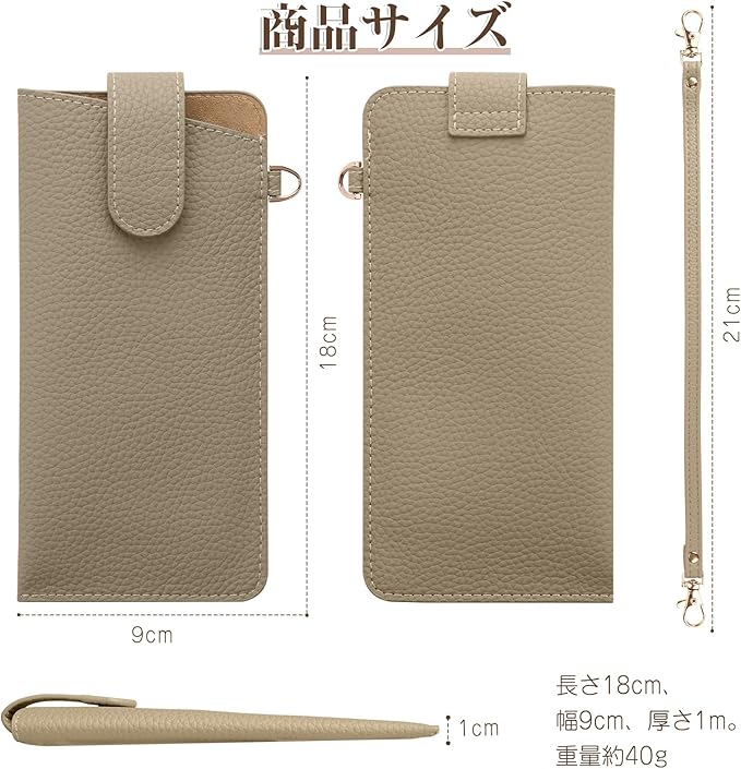 【メガネケースの商品仕様】長さ18cm、幅9cm、厚さ1m。 重量約40g。ストラップ1本付属,取り外し可能、長さ20cm。7色展開:カーキ、ブラック、アプリコットピンク、エトープ、ライトグレー、ブルー、ベージュ,コンパクトなデザインで持ち運びに便利です。