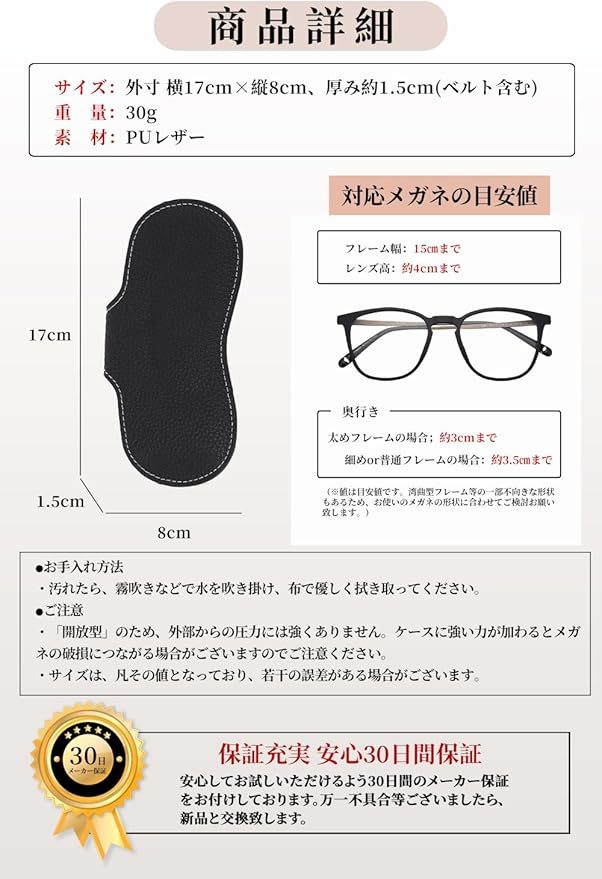 ■【商品詳細】サイズ:外寸 横17cm 縦8cm、厚み約1.5cm(ベルト含む) 重量:30g 素材:PUレザー【 対応メガネの目安値 】フレーム幅:15㎝まで レンズ高:約4cmまで 奥行き: 太めフレームの場合;約3cmまで 細めor普通フレームの場合:約3.5㎝まで(※値は目安値です。湾曲型フレーム等の一部不向きな形状もあるため、お使いのメガネの形状に合わせてご検討お願い致します。)●お手入れ方法・汚れたら、霧吹きなどで水を吹き掛け、布で優しく拭き取ってください。●ご注意・「開放型」のため、外部からの圧力には強くありません。■【.充実 30日間.】安心してお試しいただけるよう30日間のメーカー.をお付けしております。万一不具合等ございましたら、新品と交換致します。