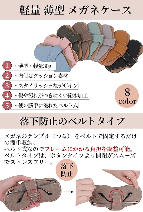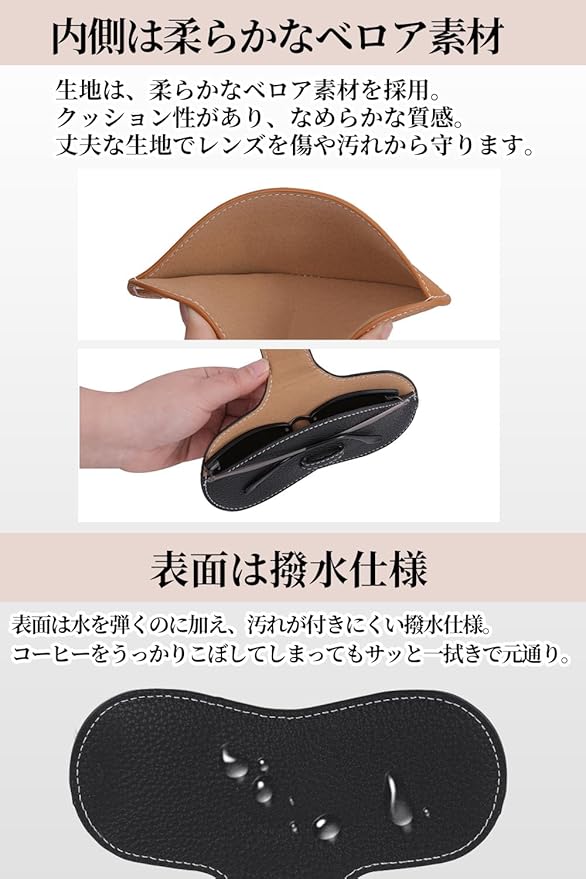 ■【落下防止のベルトタイプ】メガネのテンプル(つる) をベルトで固定するだけの簡単収納。開口部が大きく開くので眼鏡を入れやすく、フレーム全体への負荷もかかりにくい。ベルトタイプは、ボタンタイプより開閉がスムーズでストレスフリーな開閉が可能です。■【内側は柔らかなベロア素材】生地は、柔らかなベロア素材を採用。クッション性があり、軽量でなめらかな質感。丈夫な生地でレンズを傷や汚れからしっかり守ります。■【表面は撥水仕様】表面は水を弾くのに加え、汚れが付きにくい撥水仕様。コーヒーをうっかりこぼしてしまってもサッと一拭きで元通り。