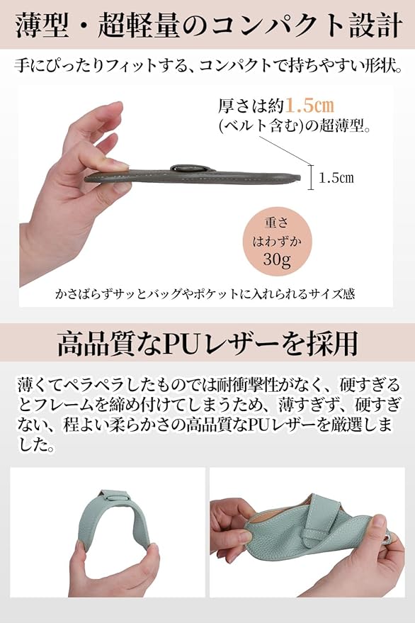 ●軽くて薄型、シシンプルながらもユニークさを兼ね備えたメガネケースです。 硬くて大きなメガネケースを持ち運びたくない"方におススメです。ちょっとしたお出かけや、家での収納に!■【薄型・超軽量のコンパクト設計】手にぴったりフィットする、コンパクトで持ちやすい形状。厚さは約1.5㎝の超薄型、かさばらずサッとバッグやポケットに入れられるサイズ感。重さはわずか30g。外寸 横17cm 縦8cm、厚み約1.5cm(ベルト含む)。