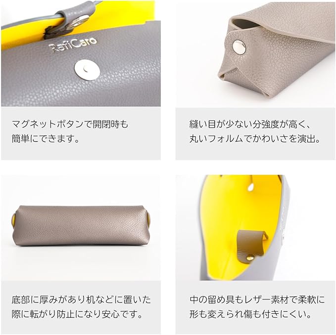 [対応タイプ] ・スクエア型・ウェリントン型・オバール型・ボストン型(最大で横14.5cm 縦4.5cm 奥行3.5cm の眼鏡まで収納可能) [サイズ] ・幅 17cm 高さ 5.3cm 奥行 4cm ・重さ 65g [素材] 牛革