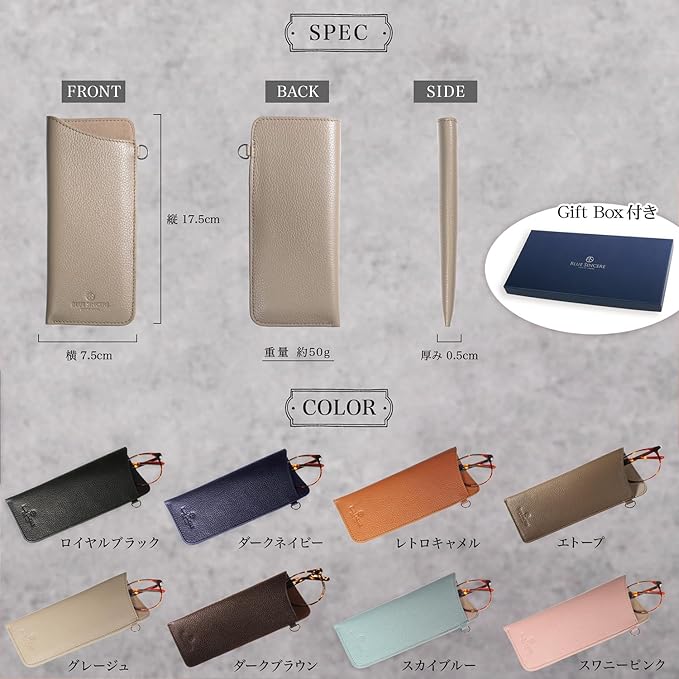 [BLUE SINCERE] ブルーシンシア メガネケース 本革 レザー スリム 薄型 ソフト 眼鏡ケース レディース メンズ 軽量 コンパクト サングラス 老眼鏡ケース メガネ入れ ギフトボックス付き/Monte -モンテ GC1 | oioioichan
