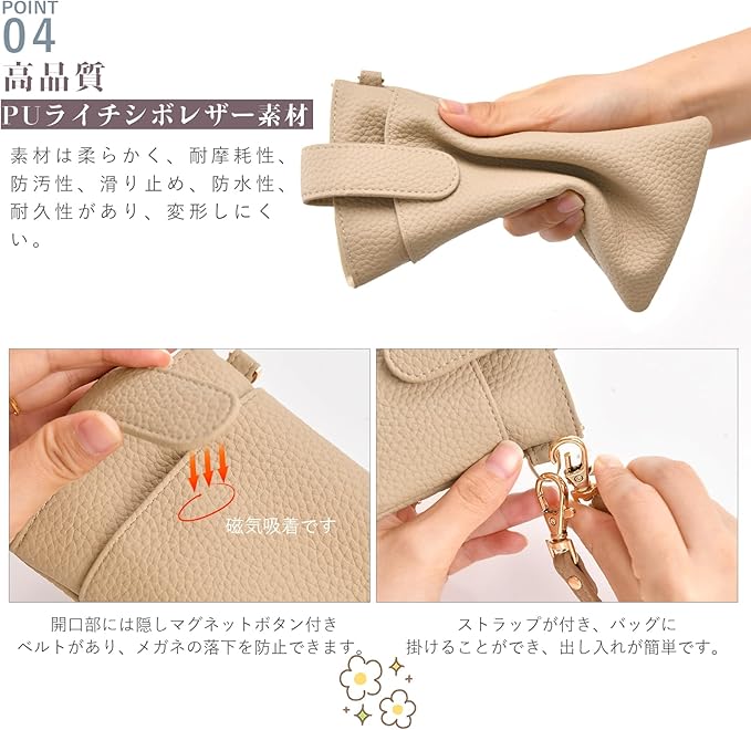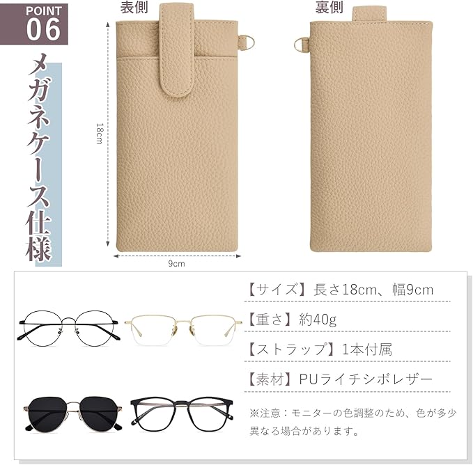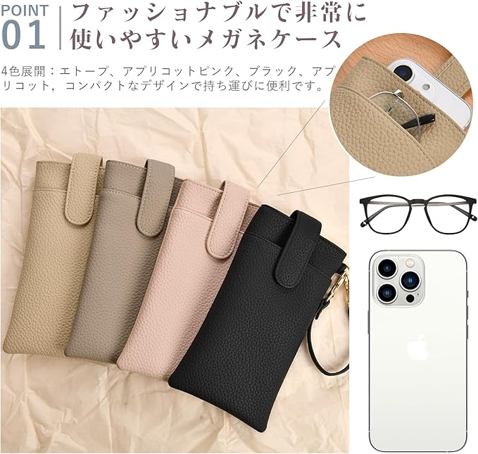 【メガネケースの商品仕様】長さ19cm、幅10cm、厚さ1m。 重量約40g。ストラップ1本付属,取り外し可能、長さ16cm。4色展開:エトープ、アプリコットピンク、ブラック、アプリコット,コンパクトなデザインで持ち運びに便利です。