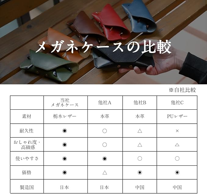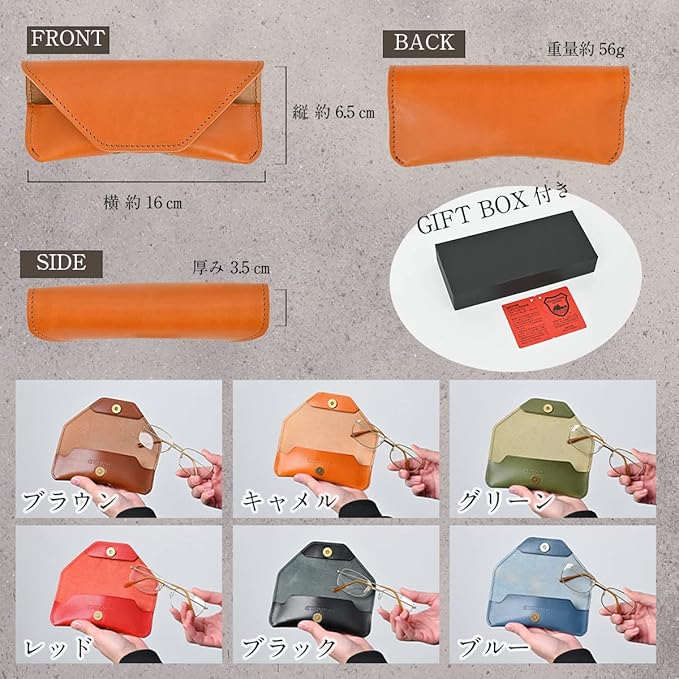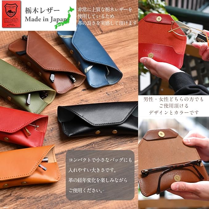 栃木レザーで日本製のメガネケースです。 本革の良さを引き出すためにあえて内側に別生地を張っていなません。 メガネのツルを革の間に挟んで収納するデザインです。 SNS映えすること間違いありません。 ねん引き(飾りねん引き) 糸も金具もすべて日本製 オールジャパンです。 お洒落 な デザイン 仕様になっている為、 ビジネス フォーマル パーティー カジュアル にもいろんなシーンでお使い頂きます。 年齢 性別 問わず、20代 30代 40代 50代 60代 男性 女性 ペア 幅広層の方にお使い頂けます。 化粧箱付きでそのまま プレゼント 誕生日 ギフト にも使えるます。