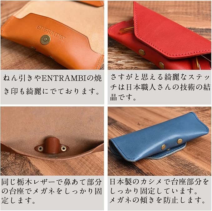 「大阪の職人のこだわりと技術」 大阪の堺にある小さな革工房の職人さんが丁寧に一つひとつ作り上げます。厳選した栃木レザーは慎重に裁断し、上蓋を開いた時に見える部分にはネン引きと呼ばれる飾り線を職人技で施すことでデザインを格上げします。もちろん使う糸も金具もすべて日本製の最高級のもので縫製して仕上げます。本革の素材の良さが際立つ高級感のあるメガネケースです。 「シーンを選ばない"斬新"なデザイン」 メガネのツルを間に挟んで収納するという斬新なデザインで革のカッティングも調整し、コンパクトでツルの端が少しチラ見えするのでSNS映えにもなりオシャレです。もちろん内部には同じ革で作った鼻パッドもついているため眼鏡も傷つきません。 化粧箱に梱包しておりますので大切な人への贈り物としても喜ばれること間違いなしです。 ENTRAMBIはイタリア語で「共に」という意味です。ENTRAMBIの名のごとく本革の経年変化と共に長くご愛用頂けるメガネケースです。