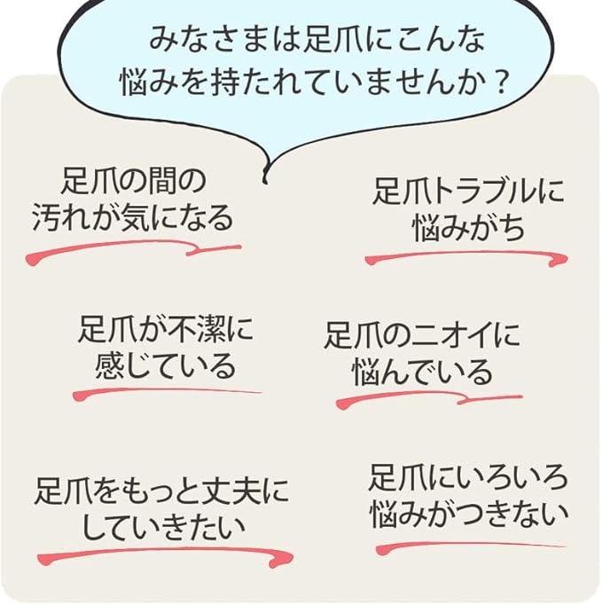【ポイント①】こんなお悩みの方へ:自信を持ってサンダルを履きたい、足爪の間の汚れが気になる、臭いに悩んでいる、丈夫にしたい。