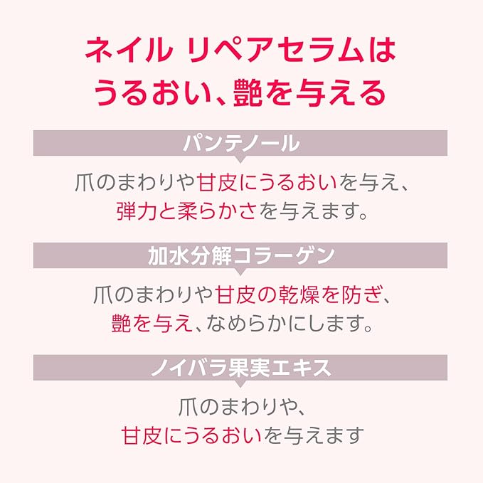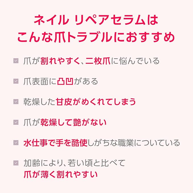 【こんな爪トラブルに】爪が割れやすく二枚爪に悩んでいる、爪表面に凸凹がある、乾燥した甘皮がめくれてしまう、爪が乾燥して艶がない、水仕事で手を酷使しがちな方に。