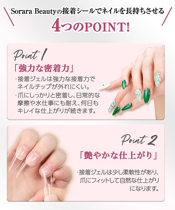 【高密着で剥がれにくい】 Sorara Beautyのネイルチップ用ジェルは、流れにくい固形状で、平爪・カーブ爪どちらにもフィット。UV/LEDライトで硬化させることで、しっかりと固定され、簡単にはがれません。