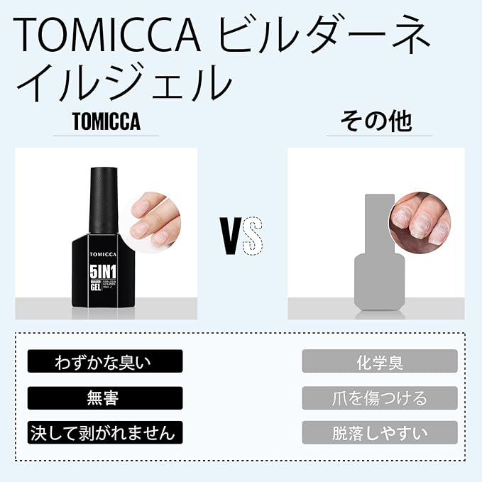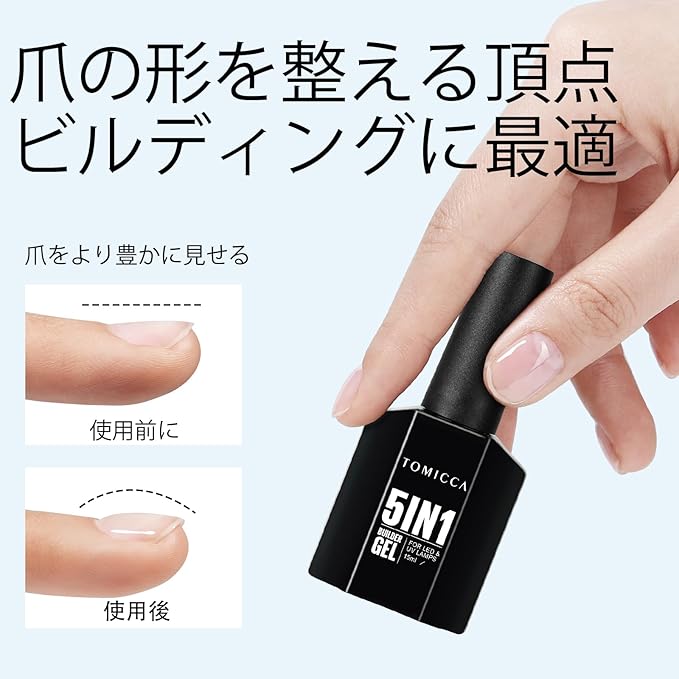 5 In 1ネイルジェル:TOMICCA 5 in 1ビルダージェルは、長持ちするプロフェッショナルな結果を.するために専門的に配合されています。この多目的製品を使用すると、爪の形を整えたり、最大1cmまで伸ばしたり、デカールやジュエリーを貼ったり、保護ベースコートや長持ちするシーラントを塗ったりすることができます。