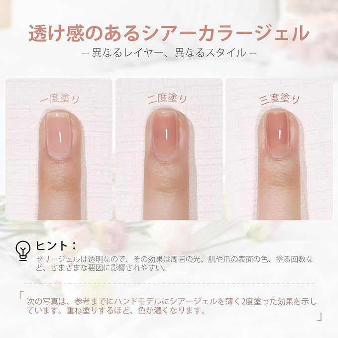4週間長持ち: ベースジェルを塗る前に爪の表面をなめらかに整えると、良いテクスチャーを作ります。カラージェルの後にトップジェルを塗ると、 みずみずしい光沢のある仕上がりになります。