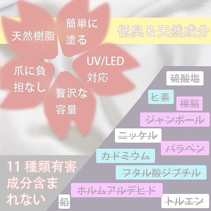 【安全材質】:自爪や肌に優しい天然レジンを使用し、無毒で刺激臭も少なく、より安心です。