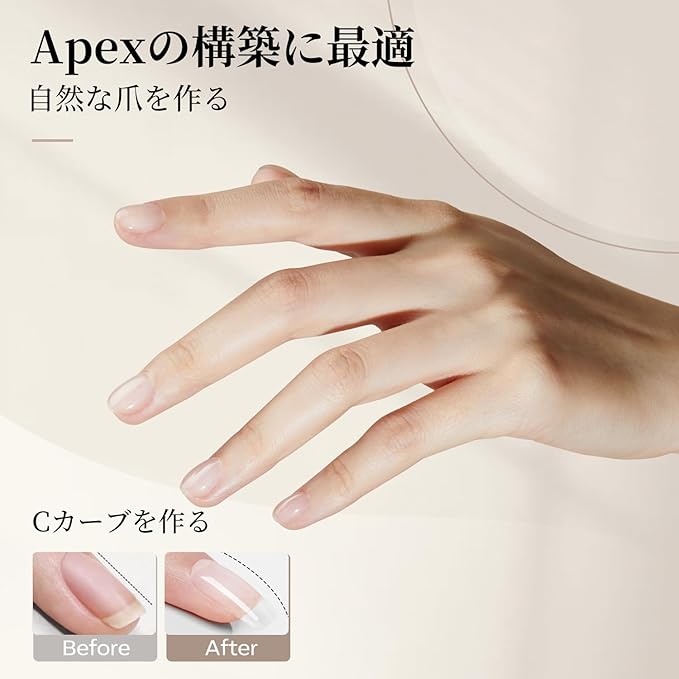 素早く簡単に塗布: 高いセルフレベリングフォーミュラと内蔵ブラシにより、簡単に塗布でき、希望する長さ、厚み、強度を作り出し、完璧な輝きのある滑らかで自然なネイルファンデーション層を確保します。(UV / LEDランプで60〜90秒間硬化する必要があります)