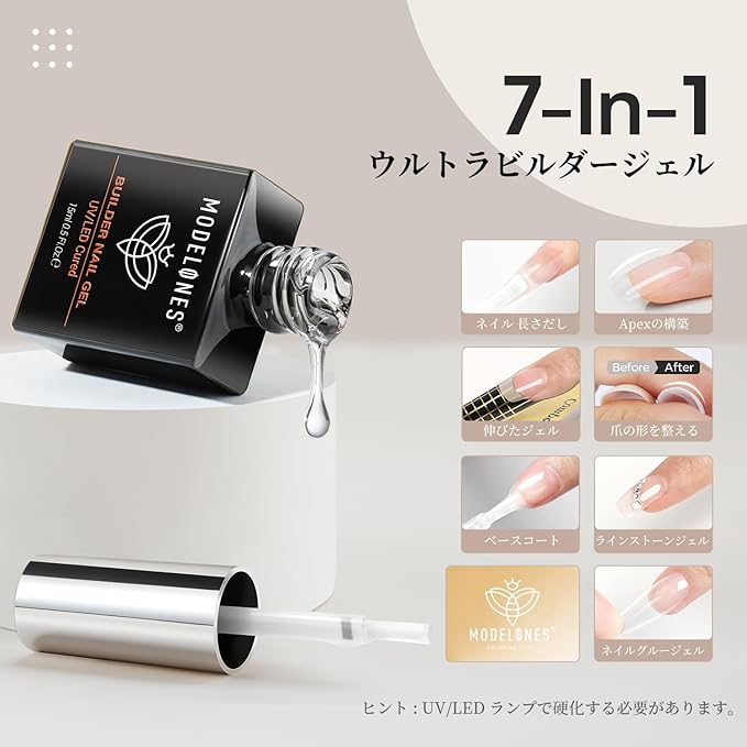 アップグレードされたビルダーネイルジェル: 革新的なフォーミュラで設計されたこの多用途のジェルビルダーは、ベースコート、頂点の構築、オーバーレイの強化、長さの延長、ネイルの整形、付け爪チップ/宝石/ジュエルの取り付けなど、7つの素晴らしい用途に最適です