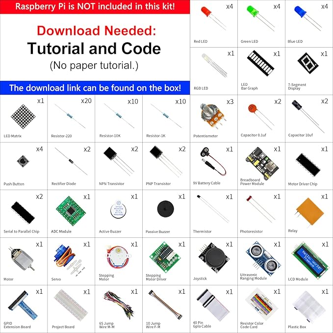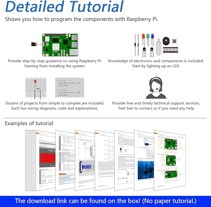 合計820ページの詳細なチュートリアル:基本的な電子機器と部品の知識をステップバイステップで提供(リンクは商品箱に記載されています) (可能、紙のチュートリアル。英語のみ)