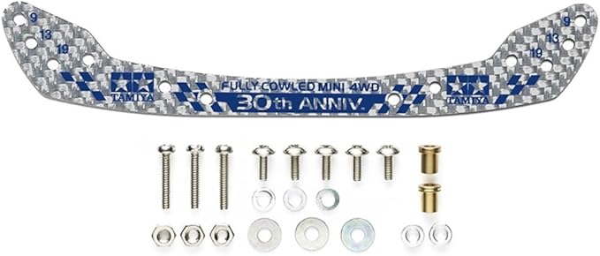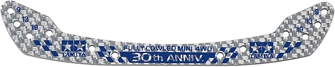 レーシーなムードを演出するシルバーカーボンの表面パターンに、フルカウルミニ四駆30周年を記念した文字をブルーでプリント