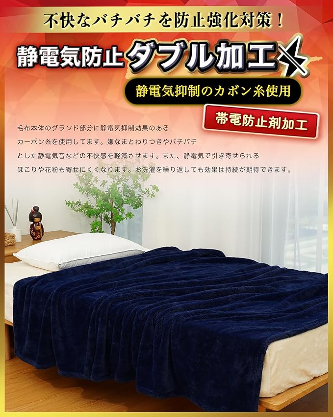 【99%静電気抑制】乾燥する季節は静電気を引き寄せ溜めこんでしまいやすく、冬に使用するマイクロファイバー 毛布が、パチパチッと静電気が走るのは困ったものです。この問題を解決するために、本社の冬用毛布では静電気抑制効果のあるカーボン糸の使用と、加工処理に静電剤を導入する二重の抑制方法を実施したとのことです。これにより、静電気を大幅に抑制できるため、まとわりつきや不快な音の軽減が期待できます。また、静電気で引き寄せられるほこりや花粉の付着も軽減されるそうです。お洗濯を繰り返しても、その効果は持続するとのことです。