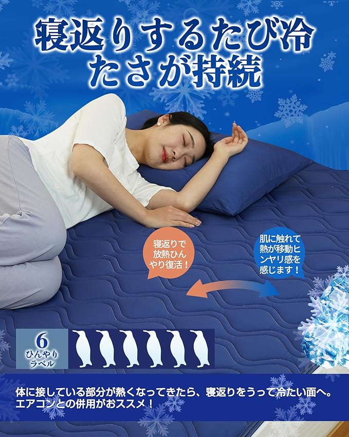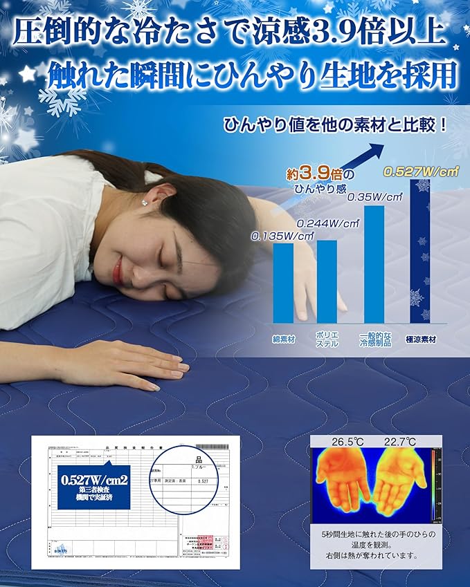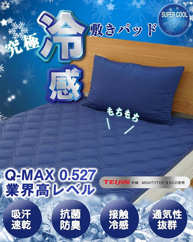【触れた瞬間にひんやり&QMAX0.527】高品質の新冷感素材を使用した新しい敷きパッドが、睡眠体験を一変させます。高い接触冷感をもたらすマイカ鉱石を蒸着したナイロン繊維を採用し、熱伝導と放熱性を高め、蒸れにくく、従来品よりもさらに涼しさを実感できます。極ひんやり敷きパッドは、Q-MAX0.527の冷感生地を採用。従来の綿と比べ3.9倍以上の冷感の生地を高密度に織り込み、より効率的な放熱と冷感持続性を実現しました。接触する瞬間からひんやり感があります。