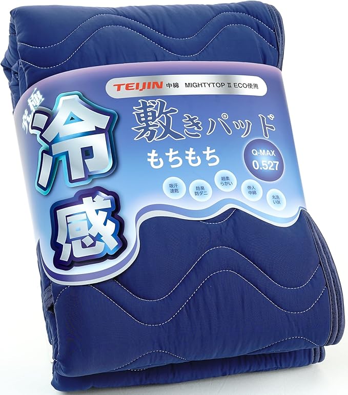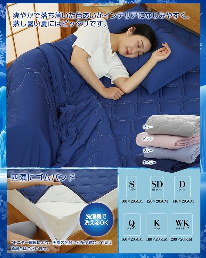【究極冷感敷きパッド!】敷きパッドの表地には『強冷感』と『柔らかさ』を兼ね備えたスムース生地を使用。さらりとした触り心地で、暑い夜でも快適な眠りを提供します。第二層には透湿性不織布。 第三層には帝人の【マイティトップ Ⅱ】の中わたを使われ、抗菌防臭効果で、臭いや細菌の繁殖を抑えます。第四層には特別開発した繊維の「吸水速乾」中わたが湿気を素早く吸収し、迅速に乾燥させるので、寝汗や不快な湿気を防ぎます。裏地には「爽やか」なリサイクルピーチ素材を使用し、快適な眠りをサポート。
