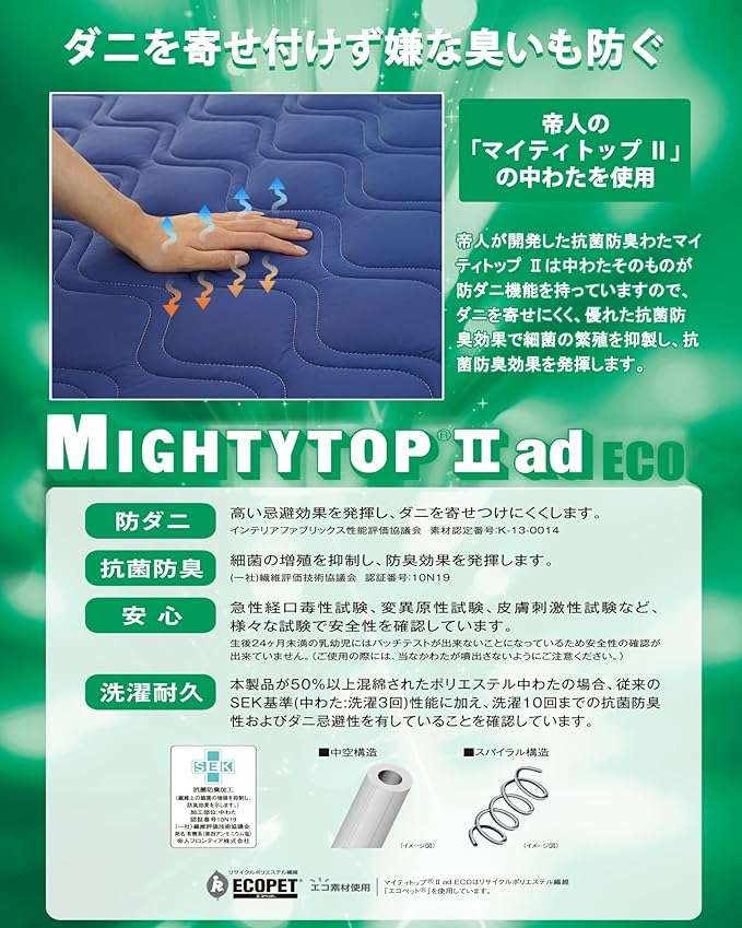 【抗菌防臭&優れた通気性・速乾性】帝人の「マイティトップⅡ」の中わたを使用、抗菌・防臭処理が施されており、菌の増殖や汗などの不快なニオイを効果的に抑えます。中綿自体がダニを寄せ付けない機能を備えています。ベッドパッド は蒸れずに速乾性と通気性が抜群であり、独自の5層構造により汗を素早く吸収してすぐに乾かし、湿気や汗でジメジメする心配もありません。いつでもサラッとした触り心地が持続します。