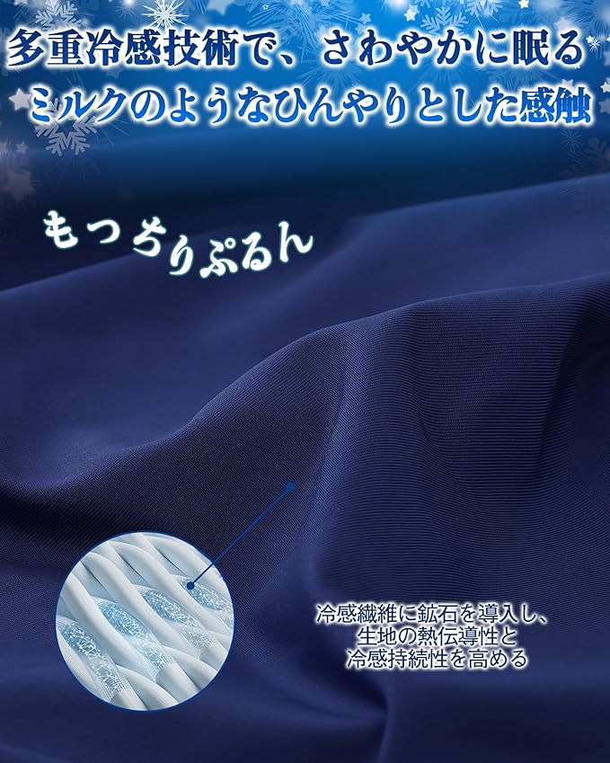 【もっちり肌触り】タテにもヨコにも伸びる3Dストレッチ生地で、目付け180g/m2で普通の2倍アップ、生地はポリウレタンを使用して、なめらかで柔らかな極上のもっちり、ぷるん触感を実現します。寝返りをするたびに、心地よい涼しさが広がり、疲れを癒やし、深い眠りへと誘います。業界屈指の冷感シーツで、清潔で快適な睡眠環境を提供し、蒸し暑い日々に快適な睡眠環境を求める皆様におすすめします。
