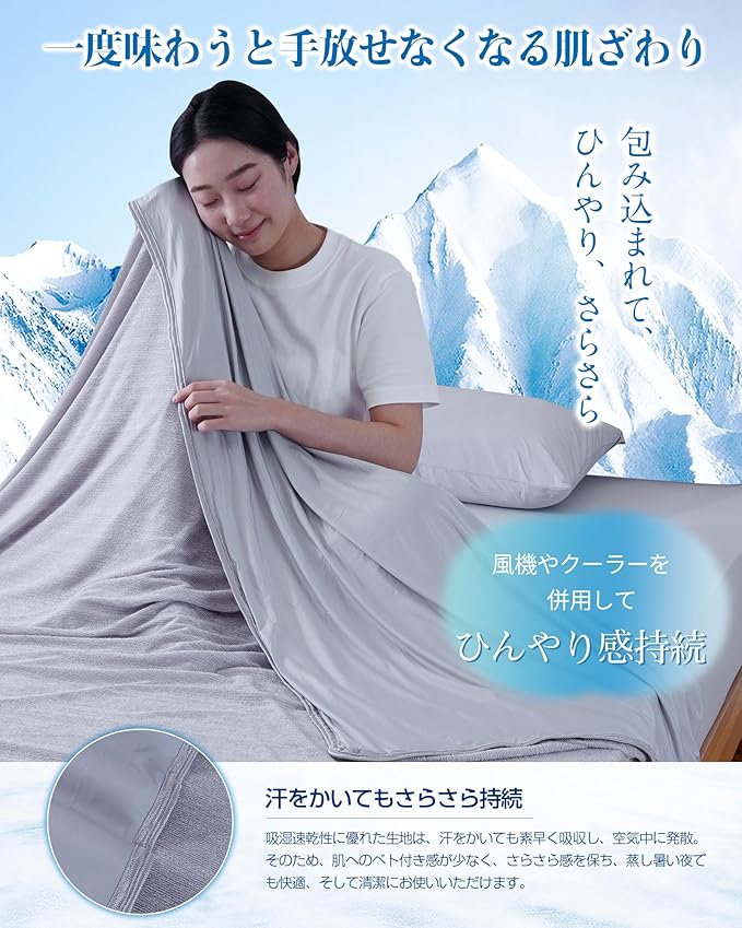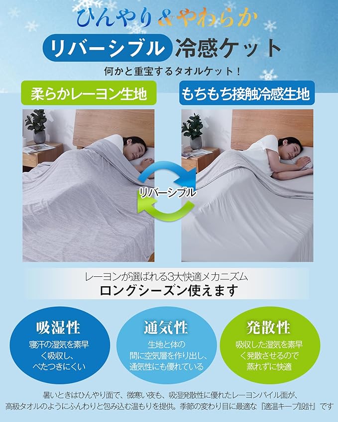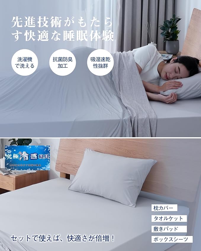 【夏のムレ・ニオイを解決する究極冷感ケット】肌が直接触れる冷感 タオルケットだからこそ、嬉しい抗菌防臭加工!優れた吸湿性と通気性で、寝汗などすぐ乾き、サラサラ感を保ちます。ムレにくく、真夏にも快適に快眠できます。タオルケット 夏用は毎日使う寝具だから、やっぱり汚れは避けられません。ご自宅で気軽に洗濯できて、いつでも清潔、快適にお使いいただけます。同じシリーズの寝具と併用していただくことで寝苦しい夏の夜をより快適に過ごすことができます。室内の温度が高すぎる場合、冷感体感が感じにくくなる場合がございますので、冷房と併用して、このひんやり タオルケットで快適に過ごせましょう!当店では皆様により良い睡眠をお届けできるよう、品質向上に努めております。商品についていつでもお気軽にお問い合わせください
