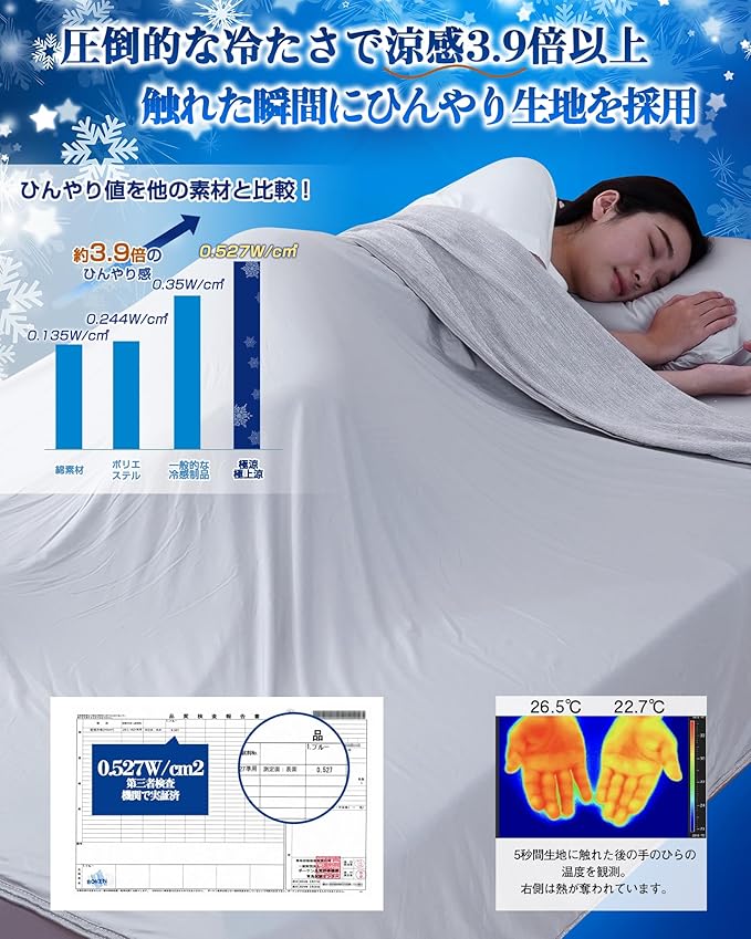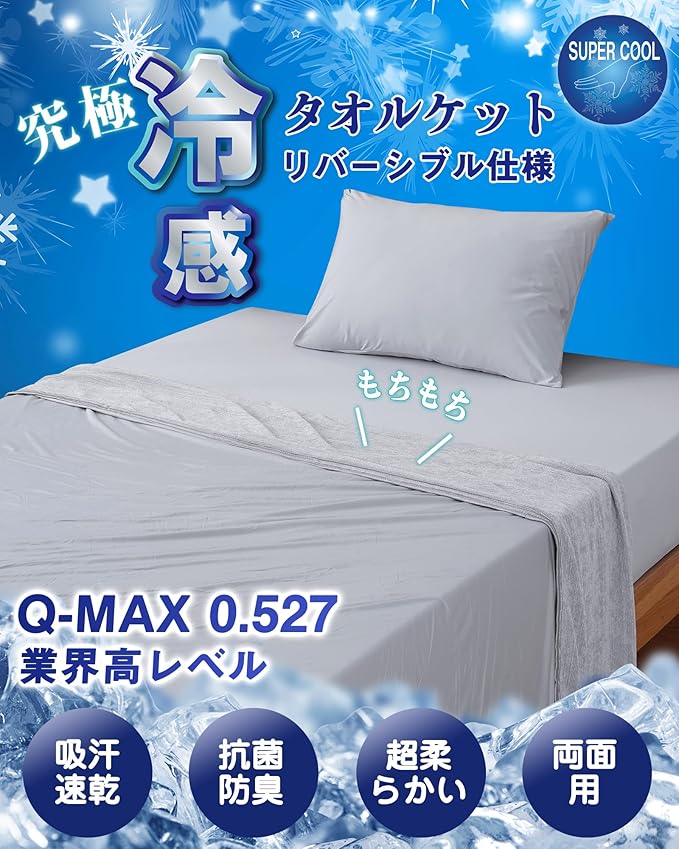 【究極の冷感 タオルケット!業界トップクラスQ-MAX 0.527】「暑い夜も快適な眠りを手に入れたい!」との思いから、何度も研究開発を重ね、革新的な鉱石冷感ナイロンとポリウレタンを融合させ、業界トップクラスを誇る本物のQ-MAX値0.527を実現した「究極冷感」寝具シリーズの接触冷感 タオルケットが誕生しました!従来の冷感素材に比べ、究極冷感生地には超高熱伝導性と優れた吸放湿機能が備わっています。業界高レベルの接触冷感値Qmax 0.527を実現し(綿素材の3.9倍)、触れた瞬間にひんやりと感じるため、暑い夏の夜にも快適な睡眠を提供します。一晩中持続して究極のヒンヤリ感を維持しつつ、ムレなどの不快感を極力抑制したサラサラな寝心地を実現しています!特に暑がりな方や、可能な限り冷房の使用を控えたい方に適合です。