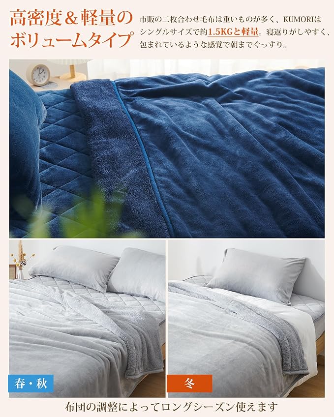 クモリ(Kumori) 2枚合わせ 厚手 毛布 シングル 冬用 あったか 中綿入り 襟付き ブランケット フランネル 三層構造 吸湿発熱 もうふ 保温 軽量 ふわとろ 掛け毛布 洗える 毛抜けない 静電気防止 暖かい ボリュームタイプ 合わせ毛布 ネイビー 140X200cm | oioioichan