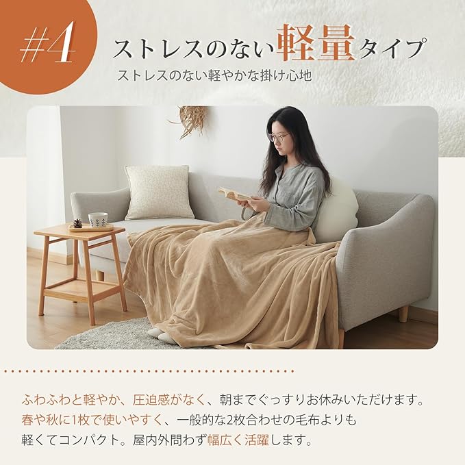 <一年中使える多用途ブランケット>:春秋はこれ一枚で、冬は掛布団をプラスして季節や気温に合わせて長くお使いいただけます。ひざ掛けや肩掛けとして冷房対策や、掛布団の間に挟んで保温力を高めたり、敷布団の上に敷いて温かく眠るなど、ソファでのお昼寝や在宅ワーク、旅行、車中、ペット用まで、さまざまなシーンで活躍します。
