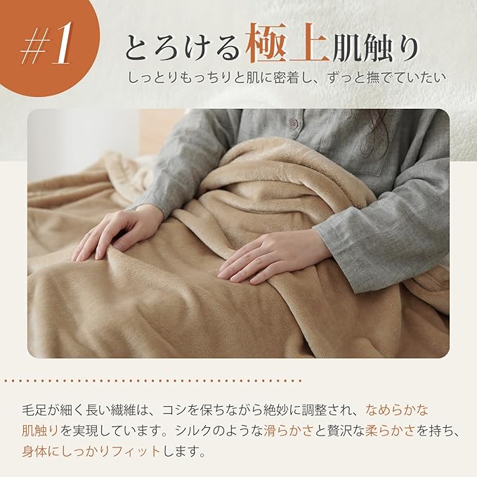 <ふんわりなめらかな極上の肌触り>:顔周りなど肌に直接触れる毛布の肌触りは非常に重要です。この毛布は驚くほどなめらかで心地よく、ふわりと柔らかく体を包み込む心地よさは、一度知ると手放せなくなります。毛玉ができにくい素材を使用しており、極上のプレミアムな感触が長く続きます。