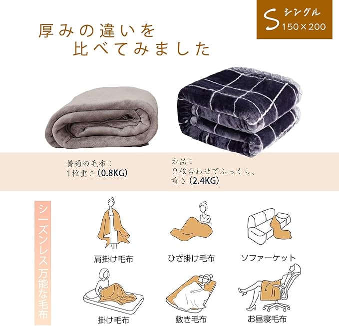 【様々な用途】敷き毛布、掛けもうふ(春 ・ 秋 ・ 夏)、布団の中掛け(冬場)、ソファー用毛布、お昼寝用毛布、車用毛布、肩掛け毛布、ひざ掛け毛布、子供用毛布、いろいろ場面で使えます