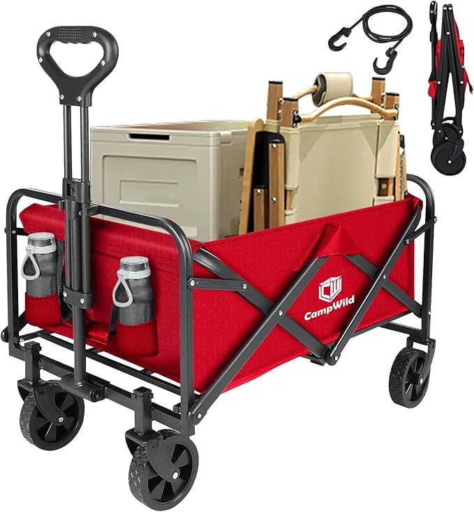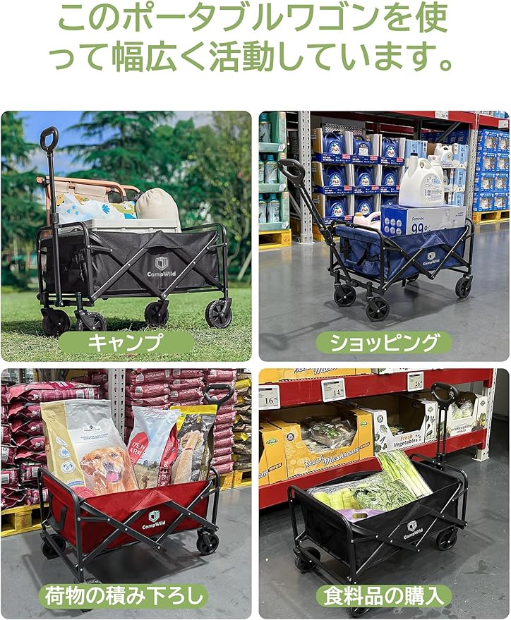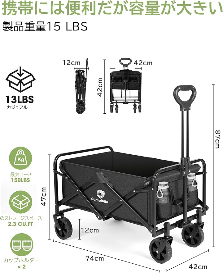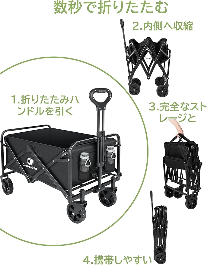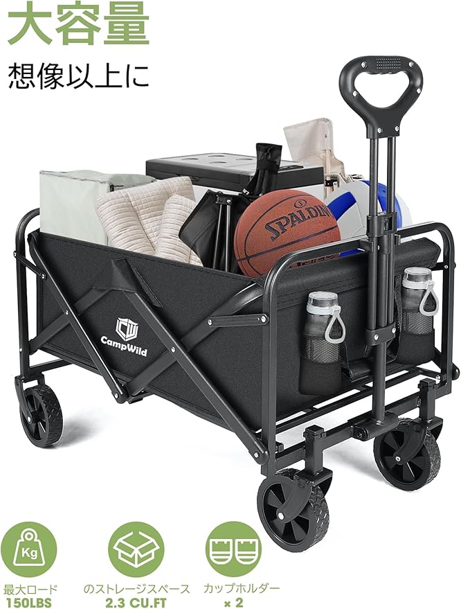 CampWild キャリーワゴン折りたたみ式キャリーカート アウトドア用キャリーワゴン 軽量 大容量100L 耐荷重100kg 収納ポケット付 コンパクト ワンタッチ 持ち運び便利 | oioioichan