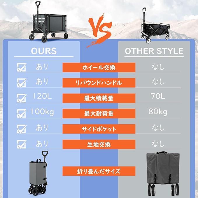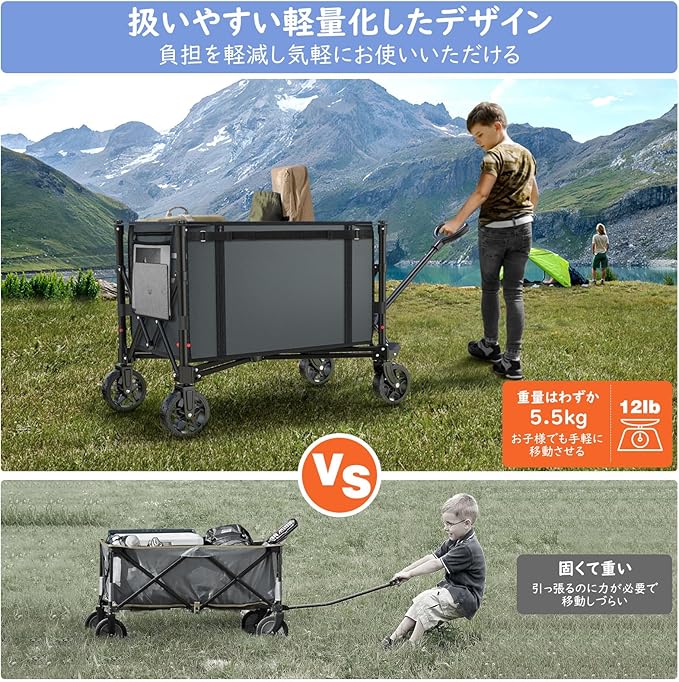 「沢山の荷物を一回で楽に移動」 多くの荷物をまとめて一度に運べるのはキャリーワゴンです。重量感のある物でも腕が疲れることもなくより手軽に移動させることができます。荷運びのあとに荷物置き場としてもご活用いただけます。積載スペースを大容量の120Lに設計したため、荷物を出し入れをより簡単に行えるうえ、ありったけのキャンプ道具や日常生活の中で重いモノを運んだり、より多くのいわゆる荷物を乗せてスーツケースのように引いて移動させる時に大活躍してくれます。