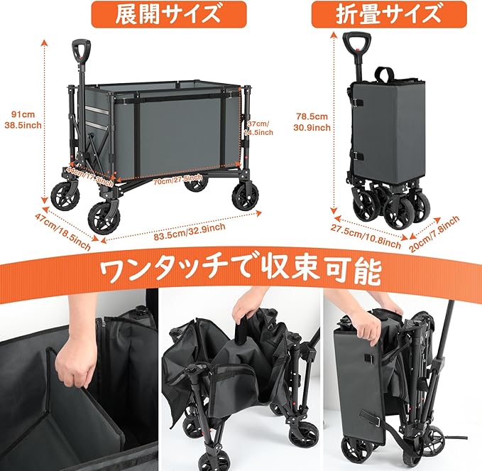 「扱いやすい安定に動かせる」 音が静かでグリップ力も優れてたゴム製タイヤを採用するため、少しの凹凸がある道でも安定してスムーズに動かすことができます。更に側面に開け閉めできるファスナーがついたデザインより、起こし大きいサイズの荷物も乗せられて、荷物の上げ下ろしもより手軽にスムーズに行えます。