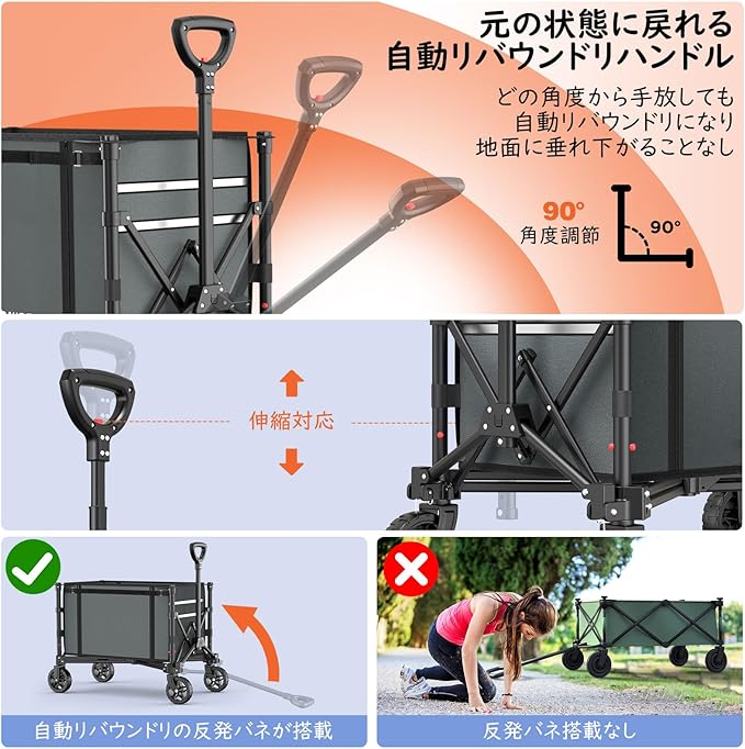 「移動しやすい思いやりのある仕様」 指への負担を軽減しながら自然な形になるハンドルの仕様より、どの方向からも片手でも握りやすくなり、力を加えやすくて効率的に伝われて、力加減や方向転換も手軽に調整できて快適にワゴンを動かせます。加えて、収納性にも優れており、赤色ロックを押しながら、伸ばしたり収縮したり必要に合わせて調整可能になります。さらに反発バネが搭載し、どの角度から手放しても自動リバウンドリになり、元の状態に戻れて地面に垂れ下がることがありません。