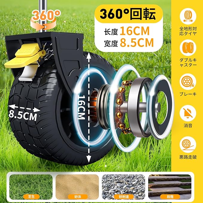 【静音オフロードタイヤ採用、あらゆる地形に対応】キャンプカートは静音設計のワイドオフロードタイヤを採用しており、芝生・砂浜・砂利道・段差など、さまざまな路面でスムーズに走行可能。振動を抑えた静かな走行音で、住宅街やキャンプ場でも快適にご使用いただけます。さらに、安全性を高めるためのブレーキ機能も搭載しており、坂道や傾斜地でもしっかりと停止できます。