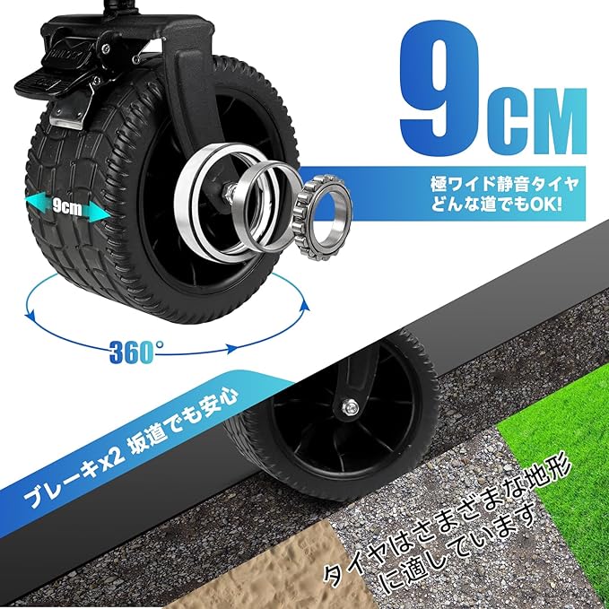 ブレーキ付きのオフロードタイヤ:キャリーカートには、耐摩耗性と耐衝撃性に優れたオフロードタイヤが装備されており、さまざまな地形に対応します。砂地や泥地、河岸の石など、どんな場所でも安全に移動することができます。タイヤの耐荷重能力は優れており、頑丈なフレームには大容量の荷物を積むことができます。さらに、大型タイヤにはブレーキが付いており、いつでも車両のスライドや制御が可能です。