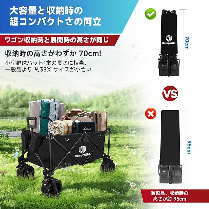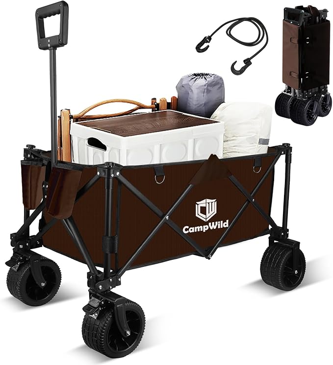 Campwild キャリーワゴン 折りたたみ式キャリーカート アウトドア用 幅広大型タイヤ 大容量150L 耐荷重150kg ワンタッチ収束式 BBQ 釣り キャンプ 運動会用などに最適 多機能カート キャンプカート (茶色) | oioioichan