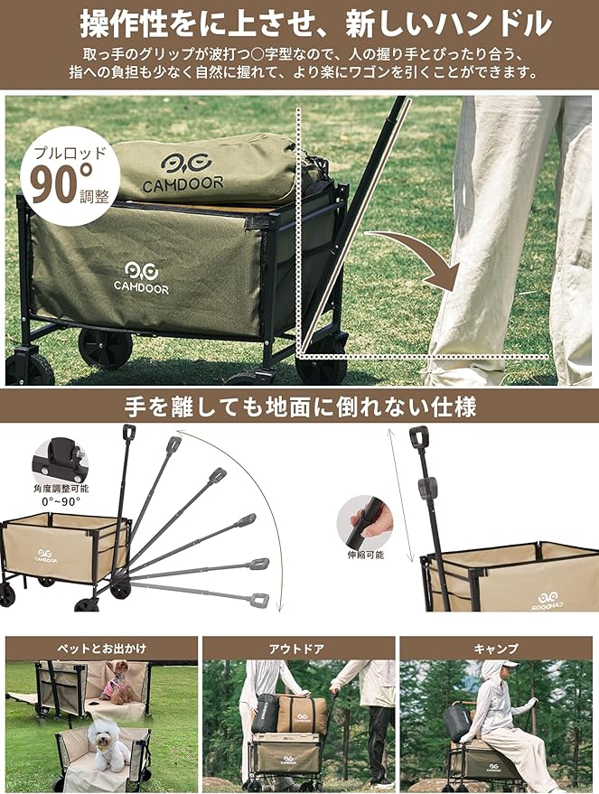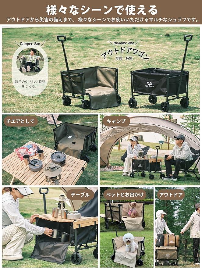 【側面がパカッと開く!】CAMDOOR キャリーカートは、荷物の出し入れが驚くほどラクラク!さらに、ペット用カートとしても大活躍。サイドドアからペットがスムーズに乗り降りでき、どこへ行くにも快適にお出かけできます。荷物がない時には、ベンチとしても使える優れもの。アウトドアシーンにぴったりな「運ぶ・乗せる・座る」の3WAY多機能ワゴンです!