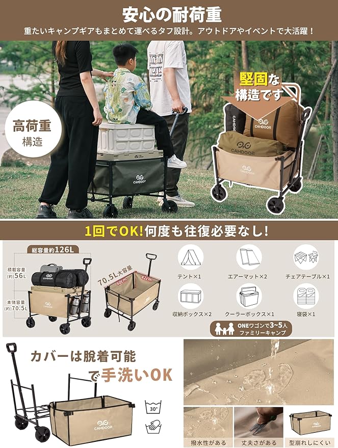 【126L最大容量で収納力抜群】多くの荷物を一度に運べるのは、このキャリーワゴンの大きな魅力。70.5〜126Lの大容量設計で、重い物でも楽に移動できるため、キャンプや公園遊びで何度も往復する必要がありません。お子さんと一緒でも、スムーズにお出かけができます!※容量70.5Lは内寸に基づく表記です。積載物の形状や積み方によっては、最大約126Lまで収納可能です。