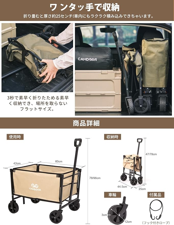 CAMDOOR サイドが開ける キャリーワゴン【 軽量設計3.9kg・3秒で簡単収納 】キャリーカート コンパクト 高耐荷重 折りたたみ式 大容量126L 折り畳み アウトドアワゴン キャリーカート キャンプカート 軽量 4輪 タイヤ キャンプ 砂浜 釣り 引越し 買い物 | oioioichan