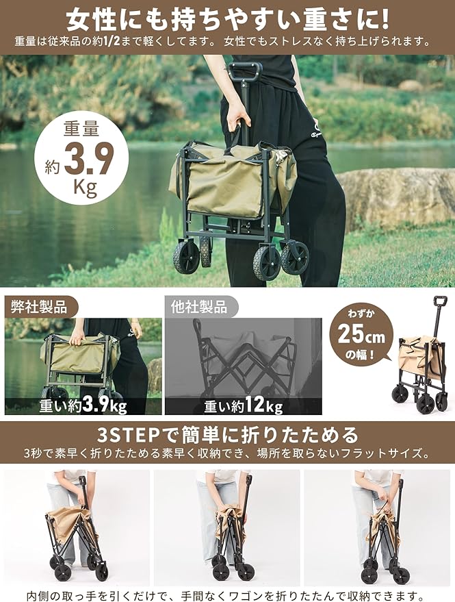 【超軽量3.9kg・携帯性に優れた設計・3秒で簡単収納】組み立て不要ですぐに使えるこのキャリーワゴンは、わずか3.9kgの超軽量設計で、軽く引っ張るだけでたった3秒で折りたたみ可能!持ち運びもとっても便利です。女性一人でも楽に収納でき、折りたたんだ後は自立するので、車のトランクにもスッキリ収納できます。さらに、今なら便利な「落下防止専用ゴムバンド」をプレゼント中
