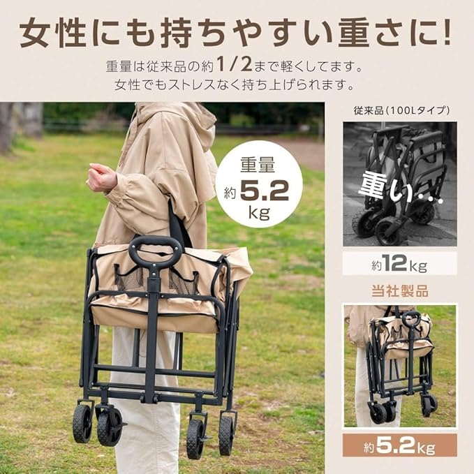 【コンパクト収納/約5.2kgの軽量タイプ】荷物の搬入後は、そのまま荷物置き場にすれば、スペースの有効活用になります。収納は、底面中央のループストラップを軽く引っ張るワンタッチ。約W50 D13 H66cmのフラットサイズに納まり、車のトランクや玄関など収納場所に困りません。重量は約5.2kgの軽量タイプ。ハンドルを手に移動も簡単。持ち運び用の取っ手付き。キャンプ以外にも、買い物をまとめて駐車場まで運ぶショッピングカートとしても便利です。